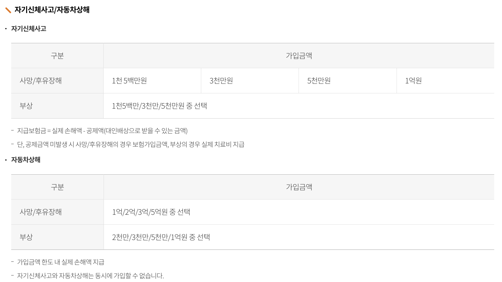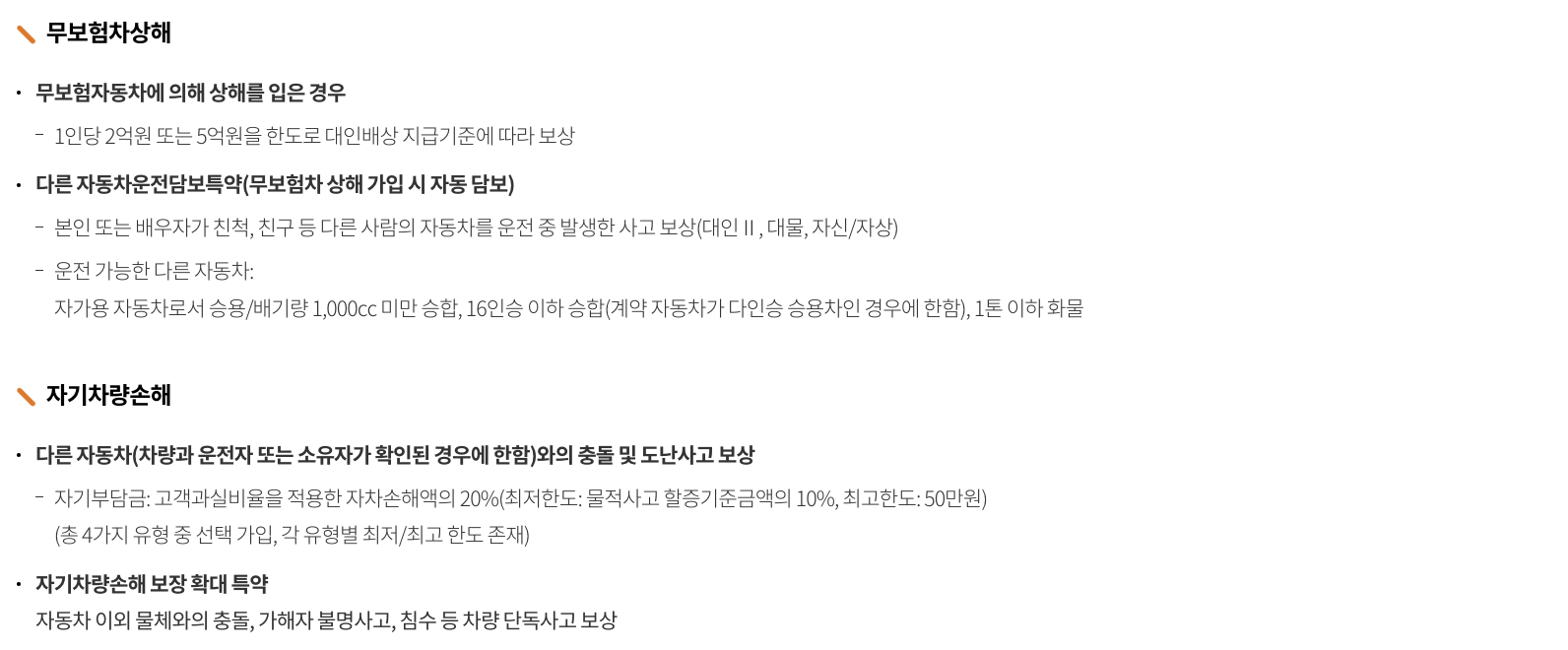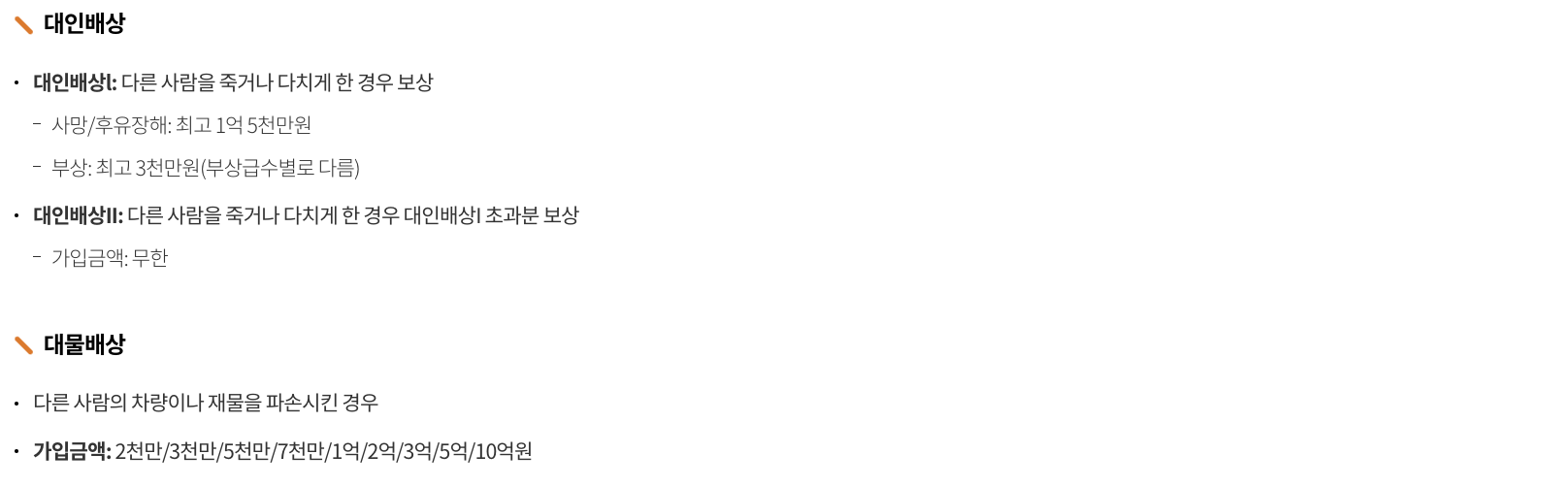 현대해상 자동차보험은 다양한 보장 내용을 제공하여 운전자와 차량의 안전을 지키는 데 중점을 두고 있습니다. 기본적으로 대인배상과 대물배상이 포함되어 있으며, 자기신체사고나 자동차상해에 대한 보장도 가능합니다. 무보험차상해와 자기차량손해 담보도 선택할 수 있어, 다양한 상황에서의 손해를 보장받을 수 있습니다.
