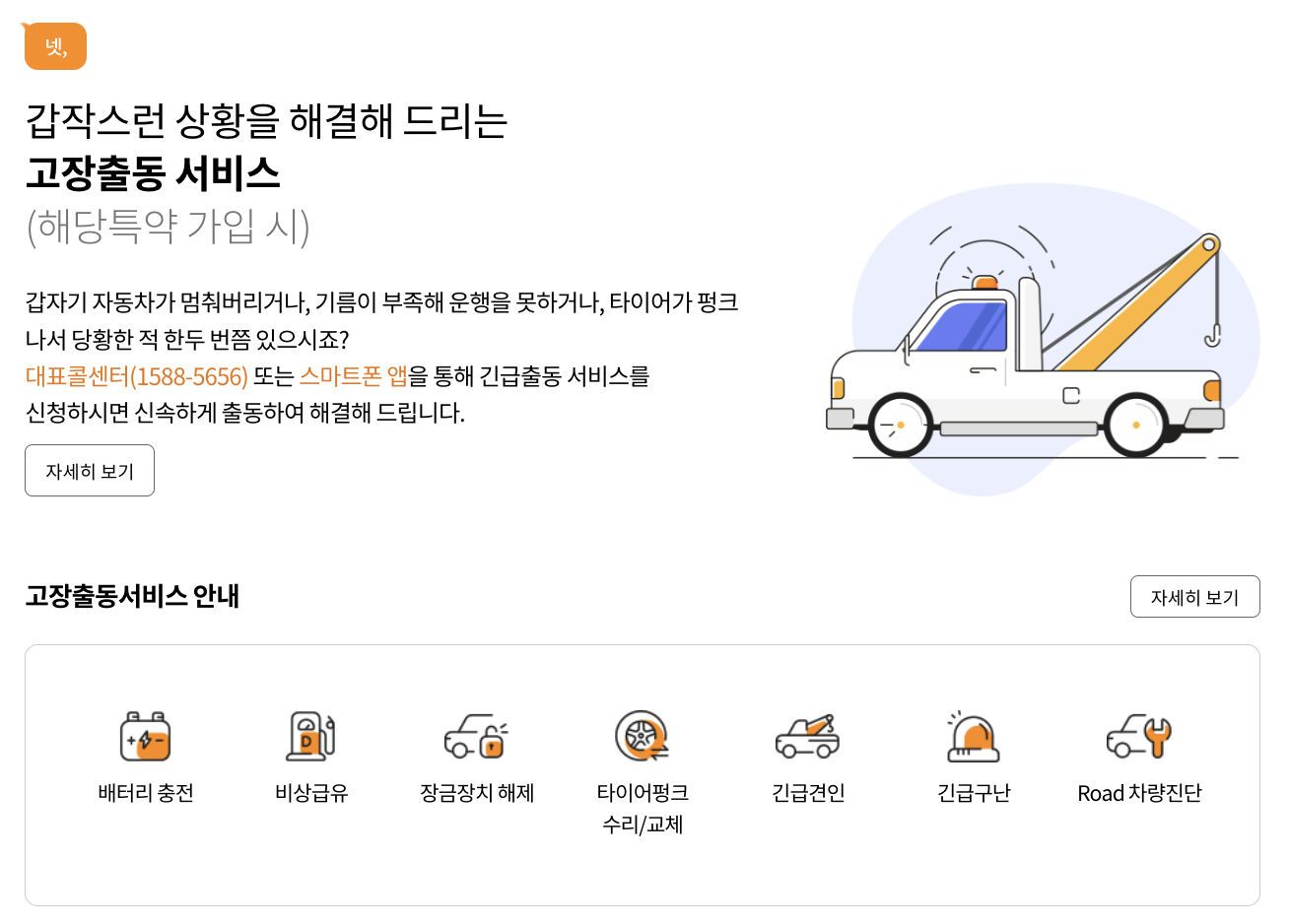 현대해상 자동차보험은 고객의 편의를 위해 24시간 언제 어디서나 가입이 가능하며, 갑작스러운 사고나 고장 시를 대비한 긴급출동 서비스를 제공합니다. 이러한 서비스는 특정 특약에 가입한 경우 이용할 수 있으며, 사고 발생 시 신속하고 친절하게 대응해 드립니다.