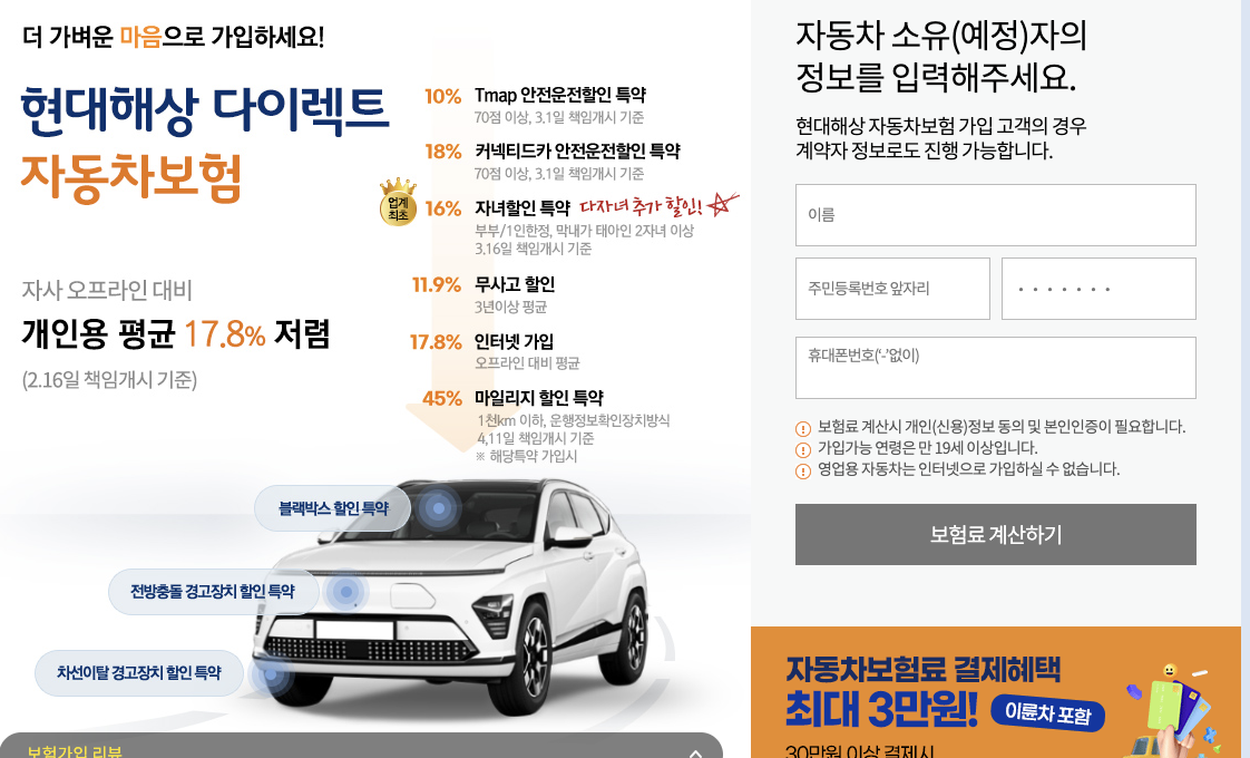 마지막으로, 현대해상 자동차보험은 편리한 가입 절차를 제공합니다. 온라인 플랫폼을 통해 언제 어디서나 쉽고 빠르게 보험에 가입할 수 있으며, 이는 바쁜 현대인에게 큰 장점으로 작용합니다.