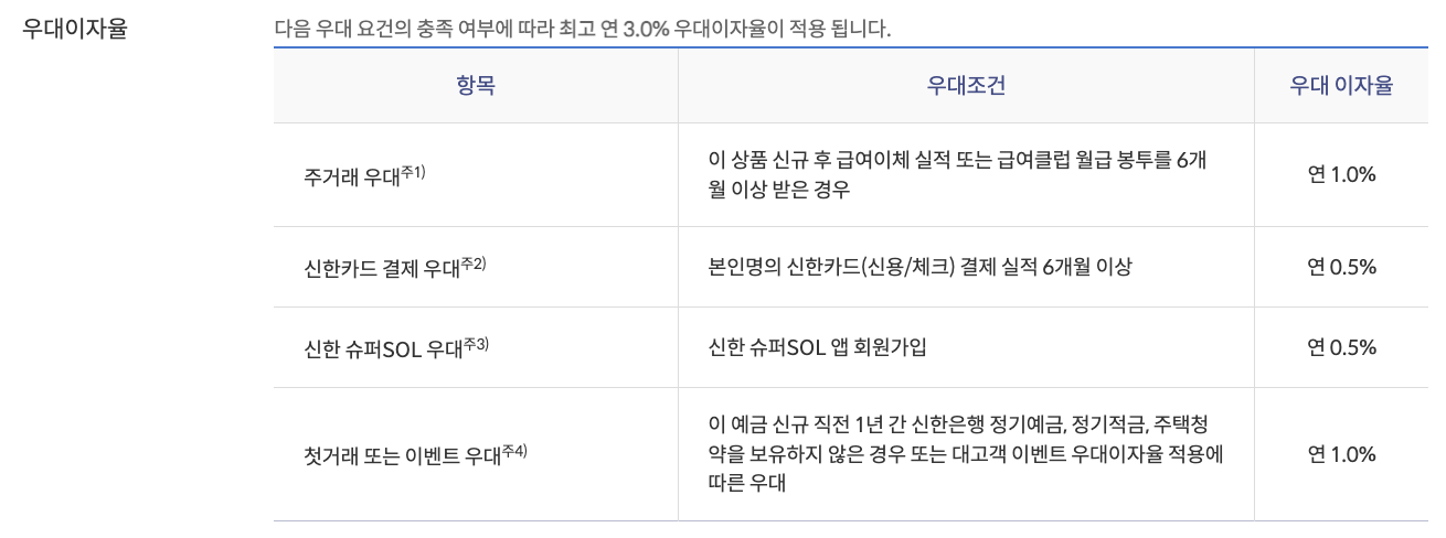 우대 금리를 받기 위한 조건은 다음과 같습니다. 첫째, 급여 이체(건당 50만원 이상) 또는 급여클럽의 월급봉투를 6개월 이상 받은 경우 추가 1.00%의 금리가 제공됩니다. 둘째, 본인 명의의 신한은행 입출금통장으로 신한카드(신용/체크) 사용 실적이 6개월 이상 있는 경우 0.50%의 추가 금리가 적용됩니다. 셋째, 신한 슈퍼SOL 회원 가입 시 0.50%의 우대 금리가 주어집니다. 마지막으로, 신규 가입자 또는 특정 이벤트를 통해 가입하는 경우 1.00%의 추가 금리 혜택을 받을 수 있습니다.