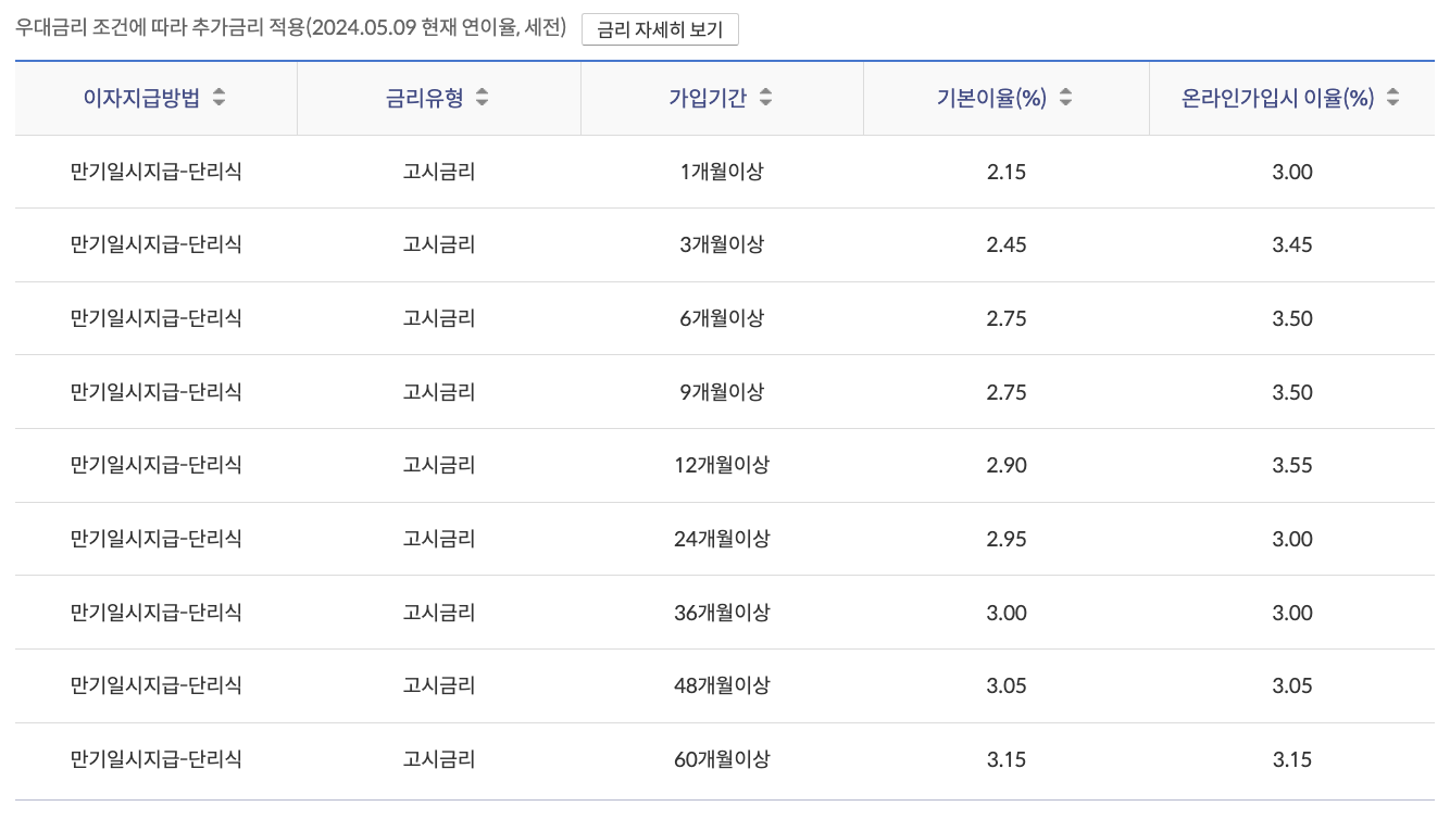 신한 My플러스 정기예금의 기본 금리는 가입 기간에 따라 다르며, 1개월은 2.9%, 3개월은 3.5%, 6개월은 3.85%, 그리고 12개월은 3.95%로 설정되어 있습니다. 또한, 우대 금리 조건을 충족시킬 경우 추가 금리 혜택을 받을 수 있습니다. 예를 들어, 가입 전 6개월 동안 신한은행 정기예금이 없었던 고객이나, 예금 보유 기간 중 특정 금액 이상을 입금한 경우 추가 금리가 적용됩니다.