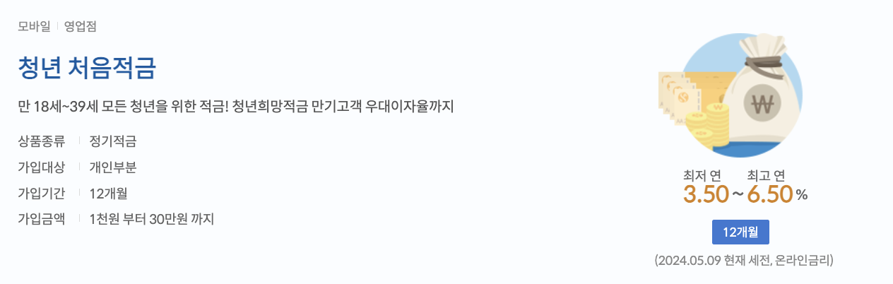 신한은행의 청년 처음적금은 청년들의 자산 형성을 지원하기 위해 마련된 상품입니다. 이 적금은 만 18세 이상 만 39세 이하의 청년들이 가입할 수 있으며, 기본 금리는 연 3.5%에 우대 금리를 포함하여 최대 연 6.5%까지 제공됩니다. 계약 기간은 12개월로 설정되어 있고, 월 납입 금액은 최대 30만원으로 제한됩니다.
