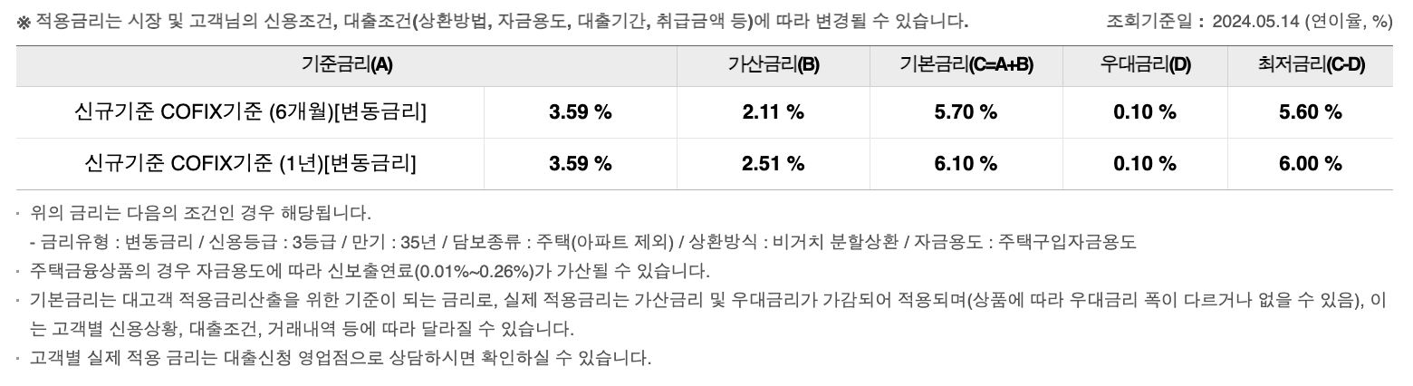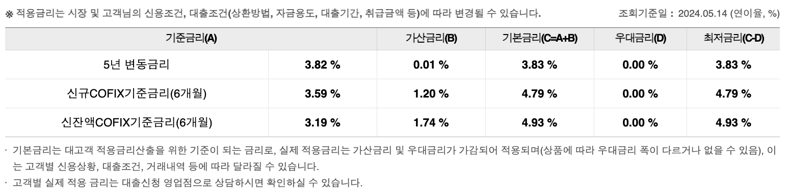 대출 금리는 기준금리와 가산금리를 합한 금액으로 적용되며, 고정금리형 혼합금리 대출, 변동금리부 대출, COFIX 연동대출 중에서 선택할 수 있습니다. 상환 방법에는 원금균등상환과 원리금균등상환 방식이 있어, 대출자의 상환 능력에 맞춰 유연하게 선택할 수 있습니다.