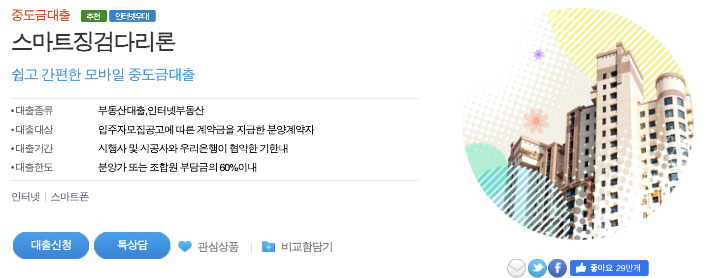 우리은행 스마트징검다리론은 분양계약금 지불 이후 남은 금액을 대출받을 수 있는 모바일 중도금대출 상품입니다. 이 상품은 특히 분양계약자를 대상으로 하며, 대출 기간은 중도금 발생 시점부터 입주지정일 후 약 3개월까지 가능합니다. 대출 한도는 분양가 또는 조합원 부담금의 60% 이내로 설정되어 있으며, 대출 신청은 우리은행의 인터넷 홈페이지 또는 스마트폰 앱을 통해 할 수 있습니다.