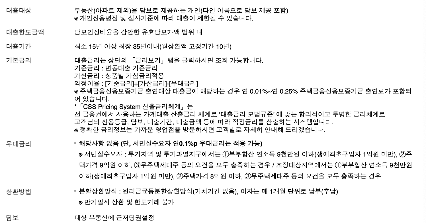 대출 조건에 따라, 최소 15년에서 최대 35년까지 대출 기간을 설정할 수 있으며, 대출 한도는 담보 인정비율을 고려한 유효 담보가액 범위 내에서 결정됩니다. 대출 신청자는 개인의 신용평점 및 은행의 심사기준에 따라 대출 승인을 받을 수 있습니다. 또한, 대출 기간 중 연 1회, 대출 원금의 최대 10%까지 중도상환 수수료 없이 상환할 수 있는 옵션도 제공됩니다.