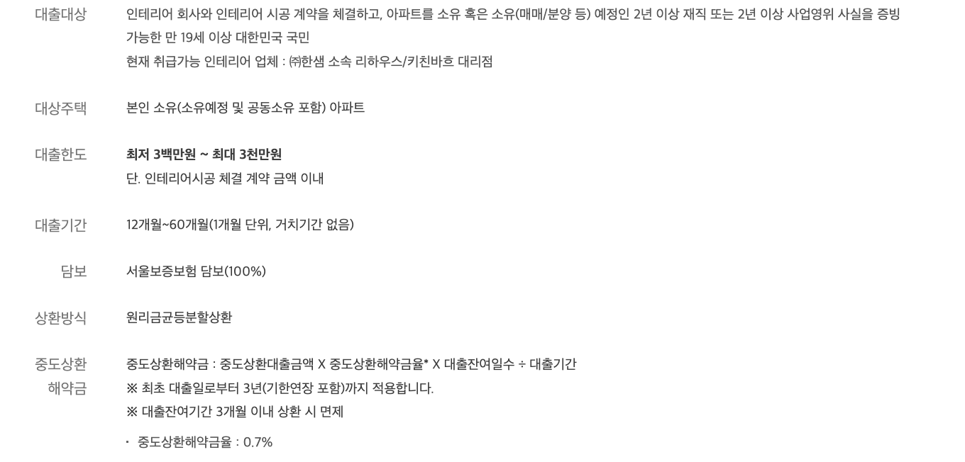 하나은행의 인테리어대출은 주거 공간의 개선을 위해 필요한 자금을 지원하는 대출 상품입니다. 이 대출은 인테리어 업체와 시공 계약을 체결한 아파트 소유자 또는 소유 예정인 고객을 대상으로 하며, 최대 3,000만 원까지 대출이 가능합니다. 대출 신청 조건은 인테리어 회사와의 시공 계약 체결자로서, 아파트를 소유하거나 소유 예정이며, 2년 이상 재직하거나 2년 이상 사업을 영위한 만 19세 이상의 대한민국 국민이어야 합니다.