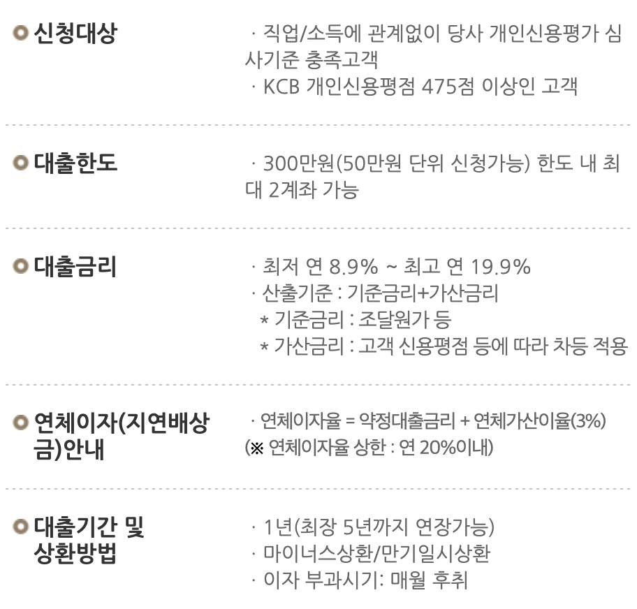 - 최소 50만 원부터 최대 300만 원까지 대출 가능