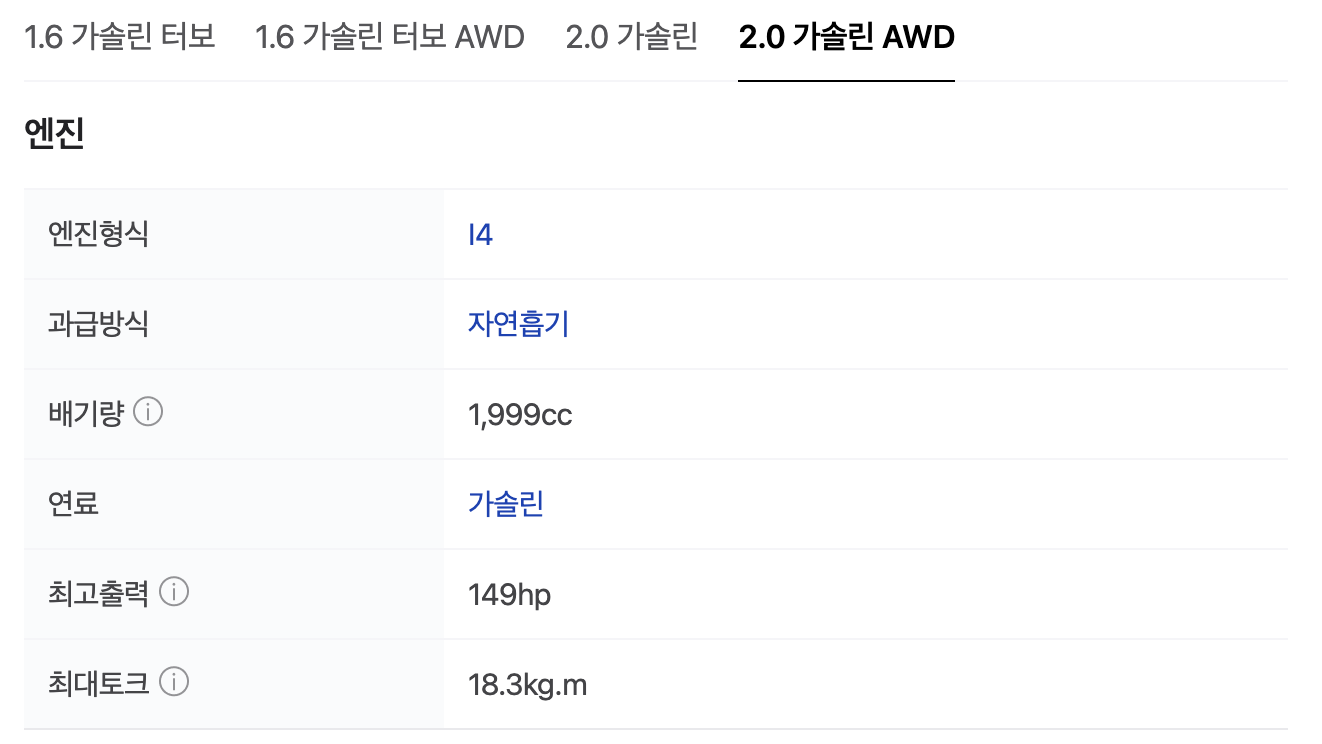 - 2.0 가솔린: 2,062만 원 ~ 2,955만 원 (트렌디, 프레스티지, 시그니처)