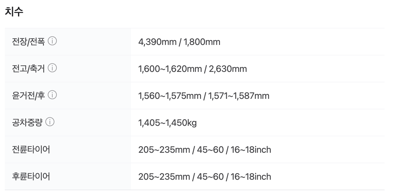 - 1.6 가솔린 터보: 2,170만 원 ~ 3,200만 원 (트렌디, 프레스티지, 시그니처, 그래비티)