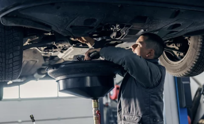 - 차량 하부의 엔진오일 드레인 볼트를 풀고, 폐 엔진오일을 완전히 배출합니다.