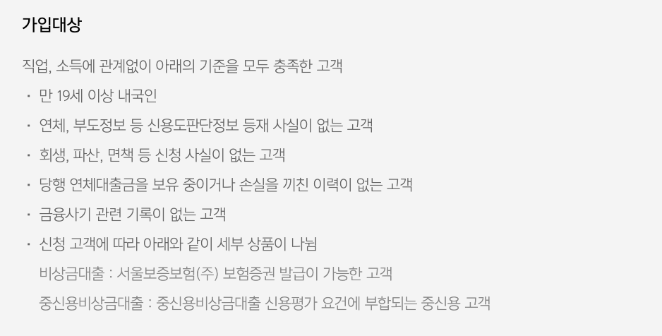 - 회생, 파산, 면책 등 신청 사실이 없는 고객: 회생, 파산, 면책 등 신청 사실이 있는 경우 대출 신청이 제한될 수 있습니다.