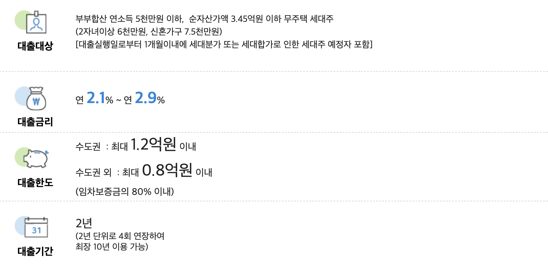 - 대출한도: 수도권 3억원, 지방 2억원 이내 (임차보증금의 80% 이내)