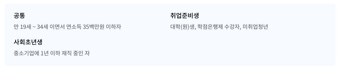 - 대상: 연 소득 3,500만원 이하 또는 연 소득 4,500만원 이하이면서 신용평점 하위 20% 이하인 자