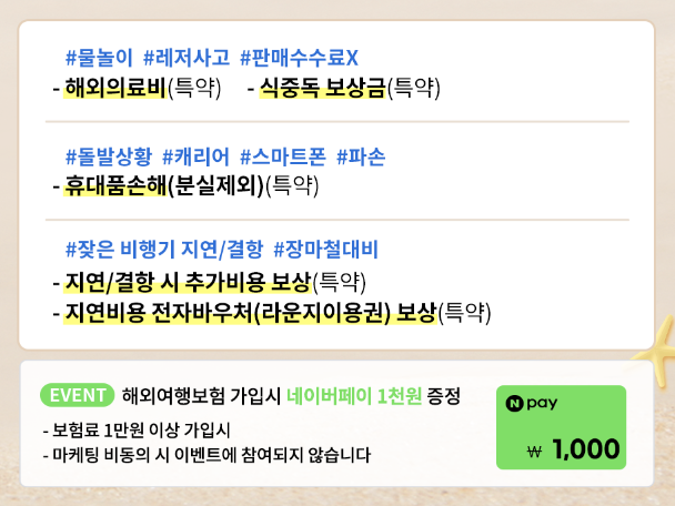 - 기존 보험 중복 여부: 실손보험에 가입되어 있다면, 실비보험과 여행자보험의 보장 범위가 중복되지 않도록 확인해야 합니다.