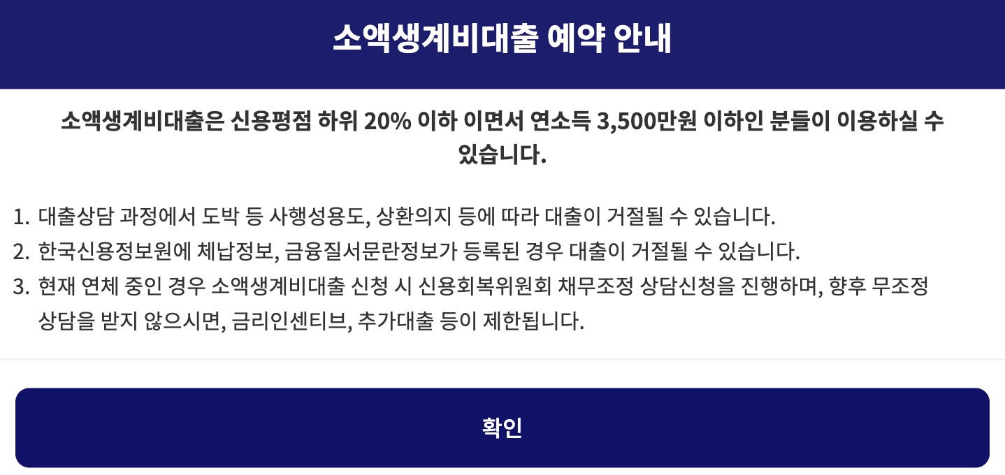 - 기존 정책서민금융 상품 이용이 제한되는 경우: 연체 이력이 있거나 소득 증빙이 어려워도 대출 신청이 가능합니다. 기존 정책자금 대출을 받지 못했거나, 이용이 제한된 분들도 소액생계비 대출을 통해 지원받을 수 있습니다.