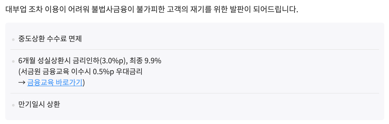 - 연 15.9% 금리: 2024년 7월 기준 연 15.9%의 금리가 적용됩니다. 다소 높은 금리로 느껴질 수 있지만, 금융교육 이수 시 우대금리 0.5%를 적용받아 최종 금리를 낮출 수 있습니다. 또한, 6개월마다 성실 상환 시 금리가 3%p씩 인하되어 최대 9.4%까지 낮아질 수 있습니다.