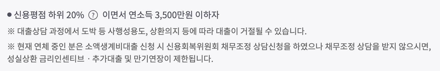 - 신용평점 하위 20% 이하 & 연 소득 3,500만 원 이하: 신용점수가 낮거나 소득이 적어도 대출 신청이 가능하며, 기존 금융권 이용이 어려운 분들을 위한 제도입니다.