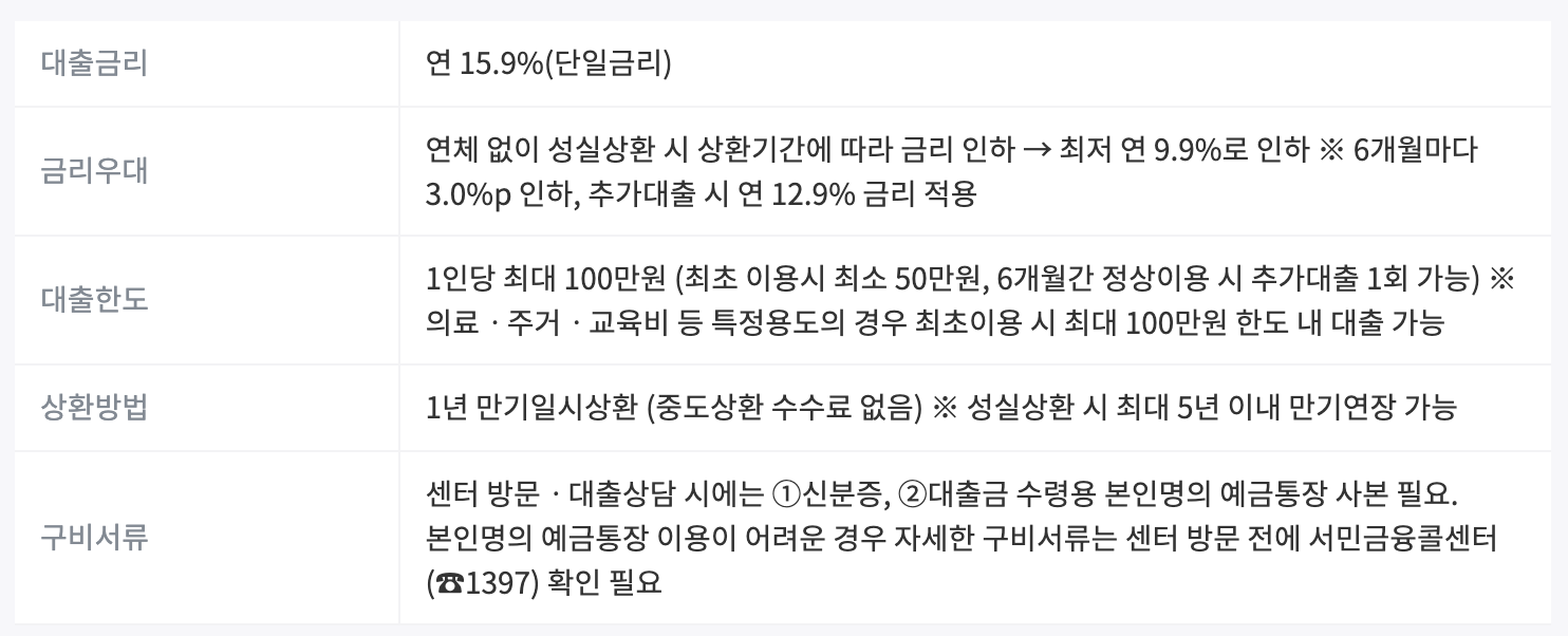 - 최대 100만 원 대출: 1인당 최대 100만 원까지 대출이 가능하며, 생활안정자금, 의료비, 대출 상환금 등 다양한 용도로 사용할 수 있습니다. (단, 최초 50만 원 대출 후 6개월 이상 성실 상환 시 추가 50만 원 대출 가능)