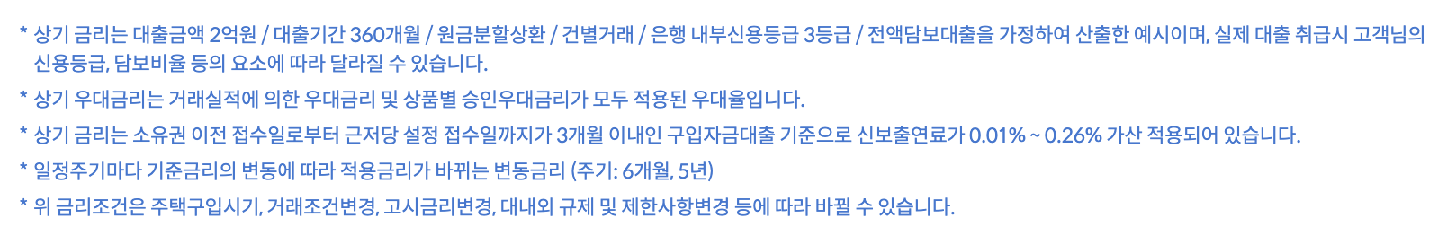 - 상환 방식: 원리금균등분할상환, 원금균등분할상환, 만기일시상환 등 다양한 상환 방식 중 선택할 수 있습니다.