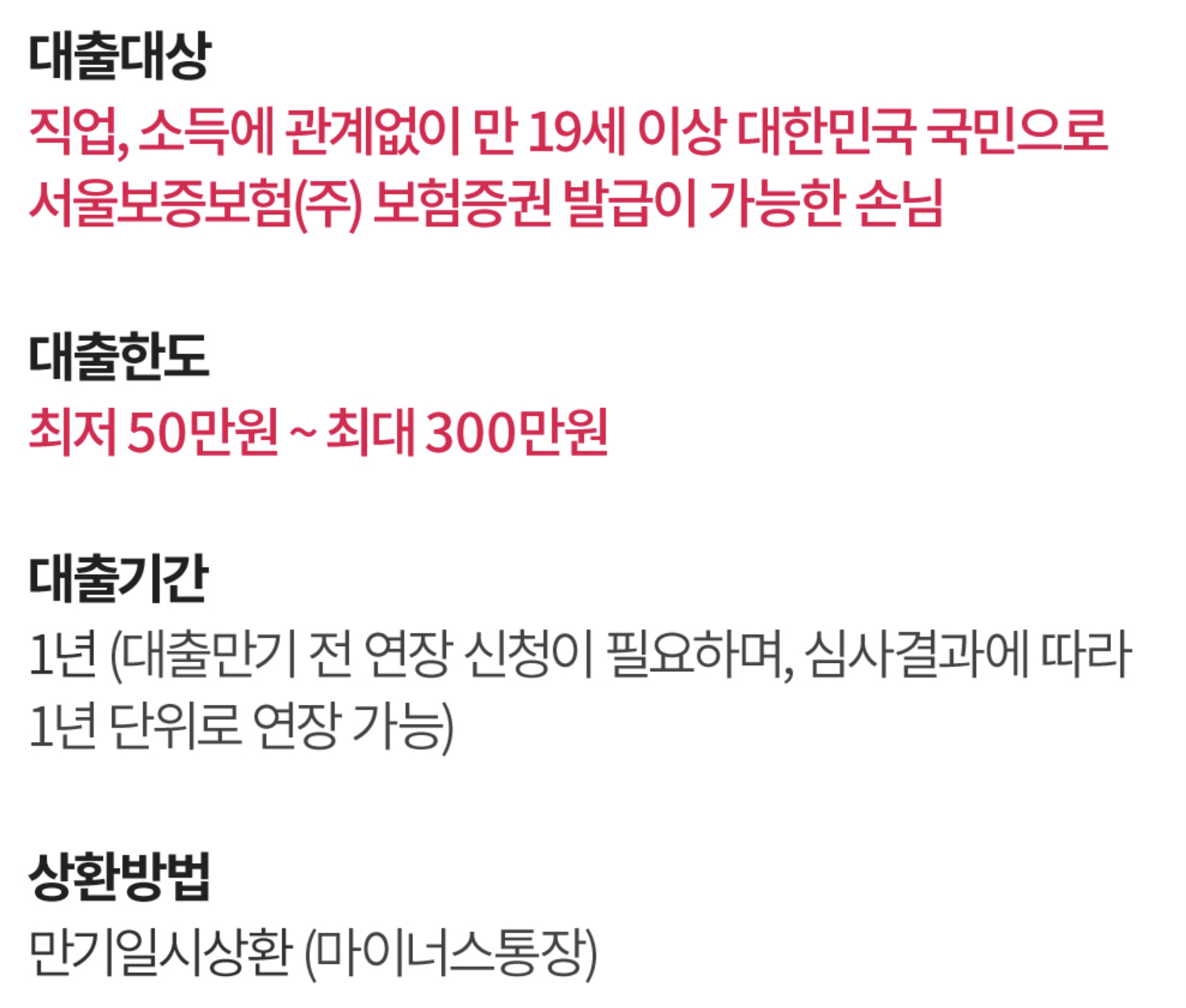 - 상환 방식: 만기 일시 상환 또는 마이너스 통장 방식 (택 1)