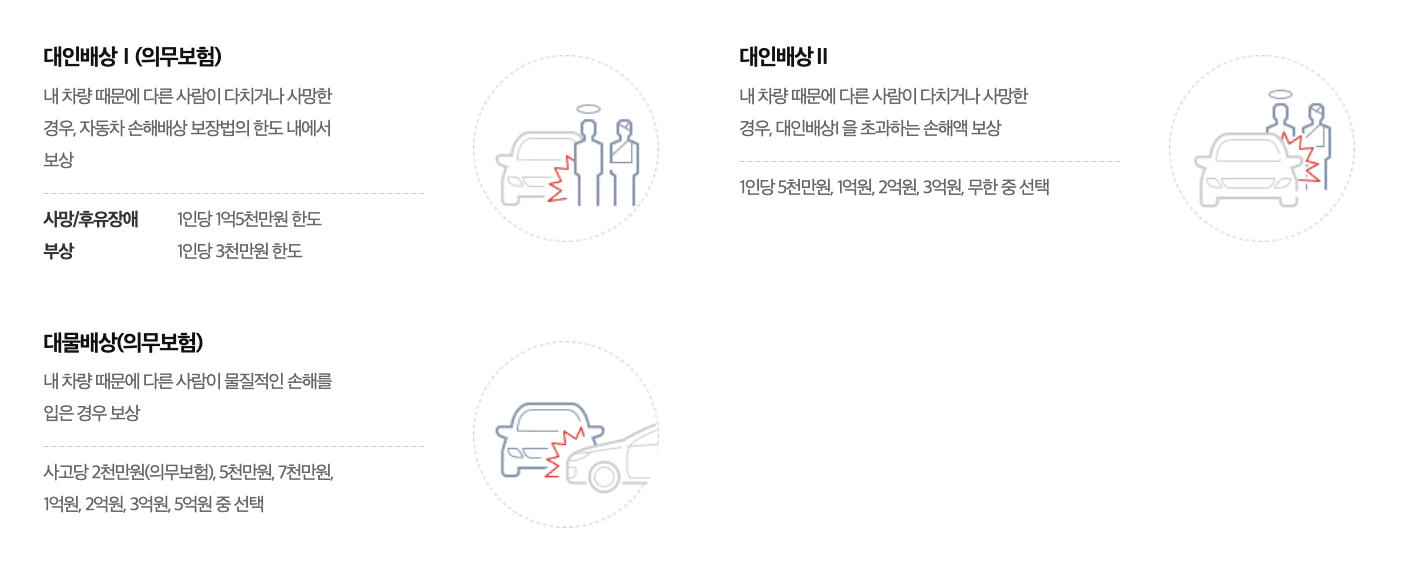 - 대인배상 I: 사고로 타인을 다치게 하거나 사망하게 했을 때 법률상 손해배상 책임을 보장합니다. (대인배상 I은 의무 가입이며, 보상 한도는 무한입니다.)