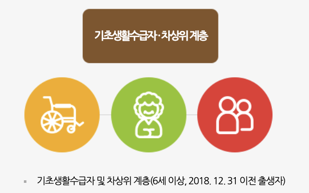 - 기초생활수급자: 생계, 의료, 주거, 교육급여를 받는 사람들