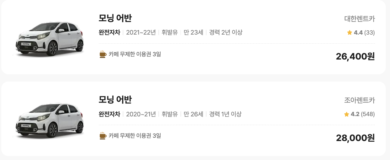 렌트카 가격은 차량 종류, 시기, 대여 기간에 따라 달라집니다.