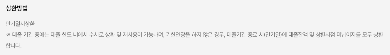 - 만기 일시 상환: 대출 기간 동안 매달 이자만 납부하고, 만기에 원금을 한 번에 상환.