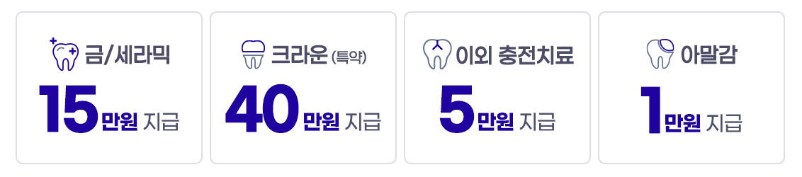 | 충치 치료 | 충전치료, 크라운 등 충치 치료에 필요한 비용 보장. | 초기 치료부터 복잡한 치료까지 보장. |