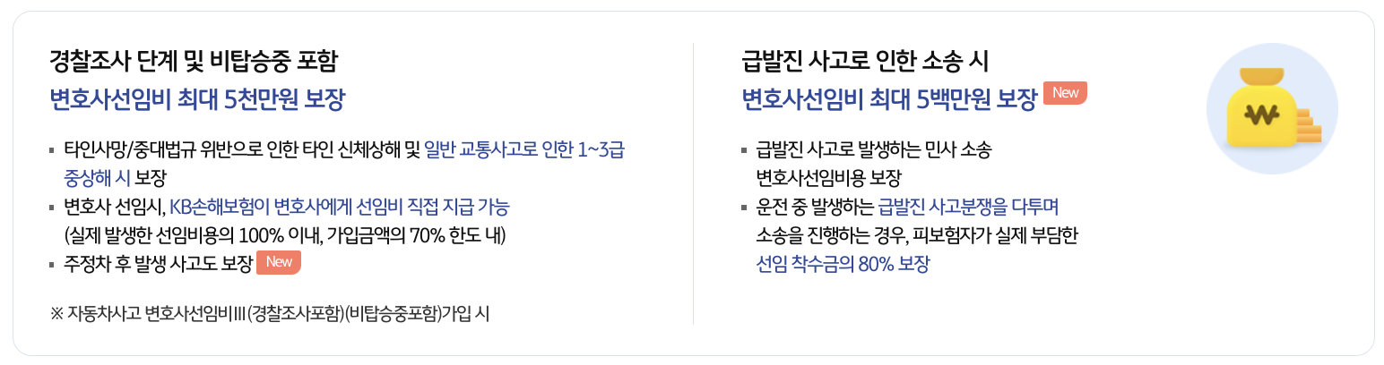 - 교통사고 처리 비용, 변호사 선임비, 벌금 등 법적 지원에 강점.