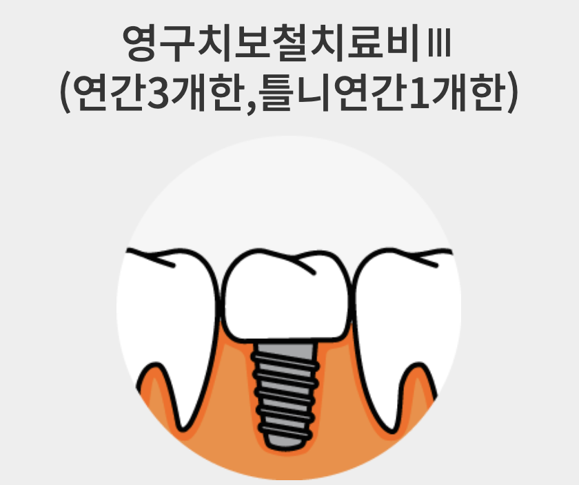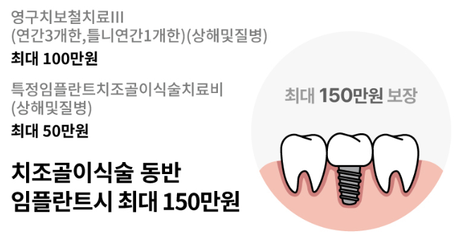 | 임플란트, 브릿지, 틀니 | 영구치 손실 시 개당 보철 치료비 지급 | 최대 100만 원 / 개 |
