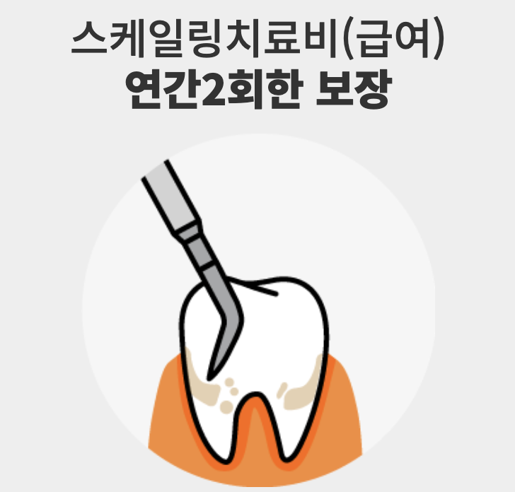 | 스케일링(치석 제거) | 연 1회 치료비 지급 | 1만 원 / 회 |