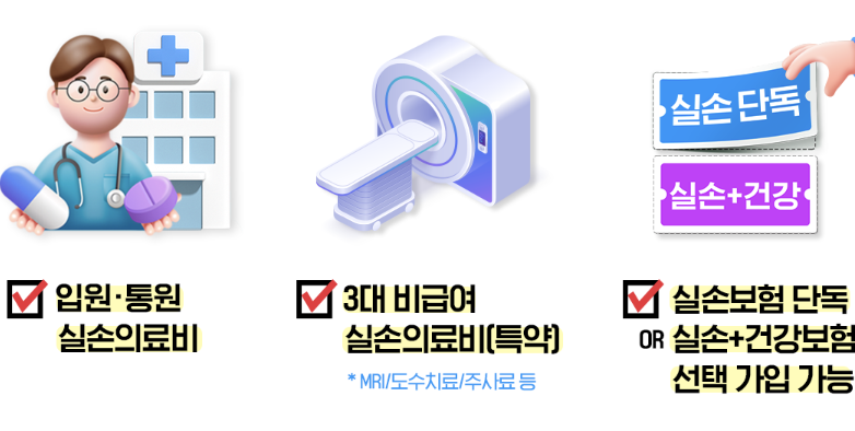 MRI 검사, 입원비, 수술비, 약제비, 통원치료비 등 대부분의 의료비를 보장하며, 국민건강보험으로 보장되지 않는 비급여 항목까지 폭넓게 보장받을 수 있습니다.