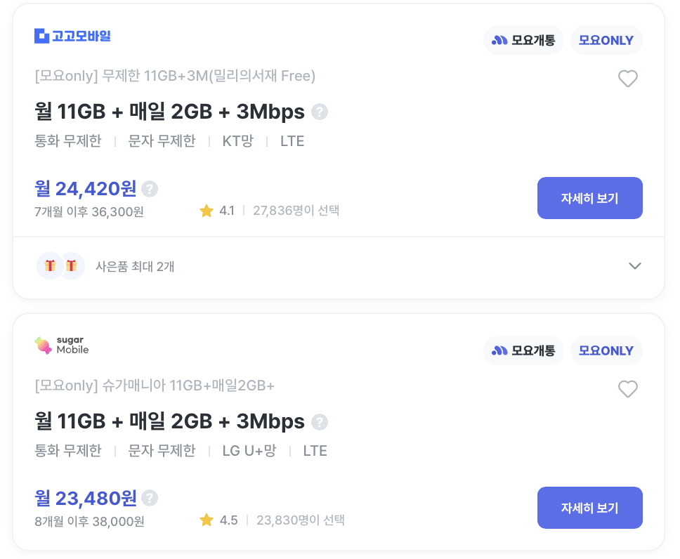 모요, 모두의요금제는 알뜰폰 요금제를 한 눈에 비교할 수 있는 사이트입니다. 데이터, 통화, 문자, 속도, 가격, 부가서비스 등 원하는 조건으로 필터링해서 찾아볼 수 있습니다. 또한 모요가 공식으로 인증하는 요금제는 신청부터 개통까지 모요가 도와줍니다. 사은품도 제공되고, 리뷰도 볼 수 있어서 신뢰도가 높습니다.