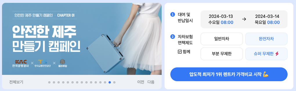제주도 렌트카 사이트에 대한 정보를 찾고 계신가요? 제주도는 한국에서 가장 인기 있는 관광지 중 하나로, 많은 여행자들이 이 아름다운 섬을 방문하기 위해 렌트카를 이용합니다. 이 글에서는 제주도에서 렌트카를 이용할 때 알아야 할 중요한 정보와 팁들을 제공해 드리겠습니다. 다양한 렌트카 옵션들과 예약 방법, 그리고 현지에서의 운전 팁까지, 제주도 렌트카 이용에 관한 모든 것을 알려드릴 것입니다. 오늘은 제주도 렌트카 비교사이트 TOP5(2024)에 대해 알려드리겠습니다.