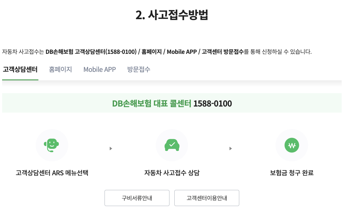 - 사고 접수: 24시간 콜센터·모바일 앱 이용