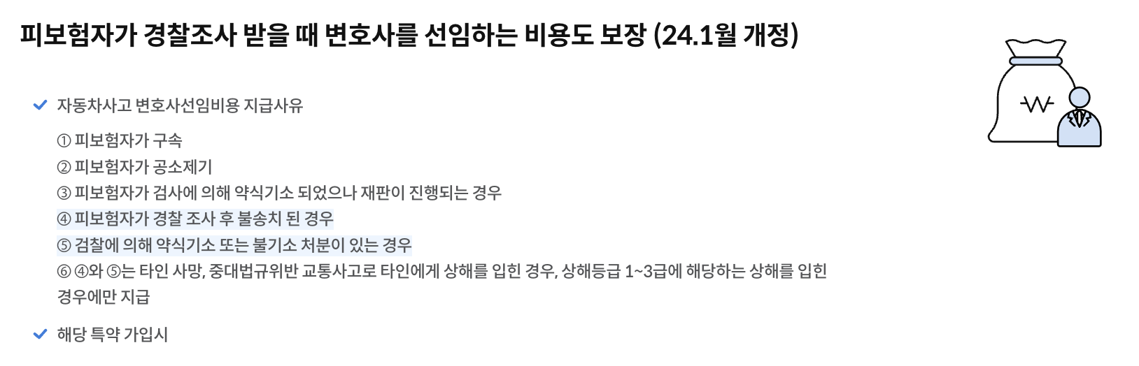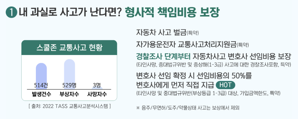 이 보험은 자동차 사고로 인한 형사적 책임부터 시작하여, 사고로 인한 상해, 골절, 심지어 소송이나 분쟁으로 인한 비용까지 다양한 보장을 제공합니다. 특히, 운전 중 중대한 과실로 인한 형사적 책임이 필요할 때, 운전자 비용 담보로 보장받을 수 있는 특약을 가입할 수 있습니다.