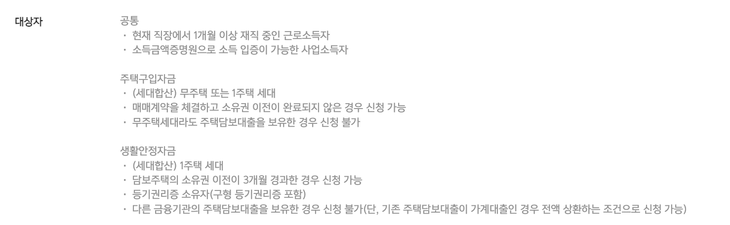 먼저, 대출 가능한 주택은 KB시세 기준 9억원 이하의 수도권 소재 아파트입니다. 대출 신청자는 1개월 이상의 근로 소득이 있거나 소득 증빙이 가능한 사업 소득자여야 합니다. 주택 구입자금의 경우, 무주택 세대로서 소유권 이전이 완료되지 않은 경우에 신청이 가능합니다. 생활안정자금의 경우, 1주택 세대로서 소유권 이전이 3개월 경과한 경우에 신청할 수 있습니다.