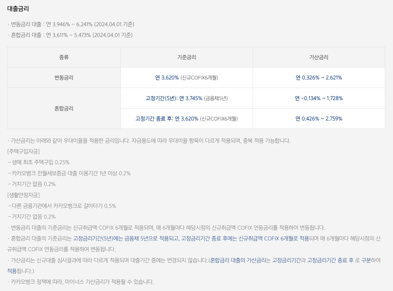 대출 금리는 변동금리와 혼합금리 옵션이 있으며, 2024년 1월 기준으로 변동금리 대출은 연 4.138%에서 4.665% 사이, 혼합금리 대출은 연 3.483%에서 3.812% 사이로 책정되어 있습니다. 가산금리는 다른 금융기관에서 카카오뱅크로 갈아타는 경우 0.7%의 우대이율을 적용받을 수 있습니다.