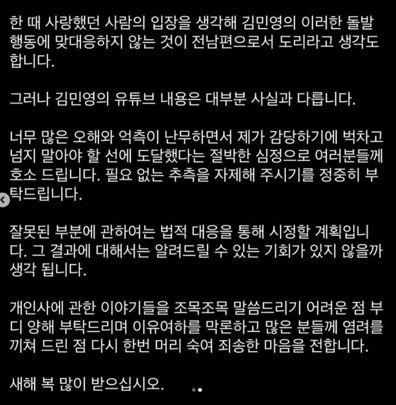 얼마전 아옳이의 이혼에 대한 영상 업로드가 있은 후 대중의 비난을 받은 서주원이 오늘 반박게시글을 올려 화제가 되었습니다. 아옳이가 업로드한 영상에 따르면 서주원은 결혼 초반부터 여자 문제가 많았으며 전문가의 도움을 받으며 결혼생활을 이어가려 했지만 또다시 외도를 하며 결국 이혼에 이르렀다고 밝혔습니다. 이를 통해 많은 사람들이 서주원을 향해 비난의 목소리를 높였으며 그의 레스토랑은 별점 테러를 맞기도 했습니다. 오늘 서주원은 개인 sns 통해 입장문을 발표하였습니다. 하지만 서주원의 입장문 업로드에도 불구하고 대중의 시선은 여전히 차갑습니다.