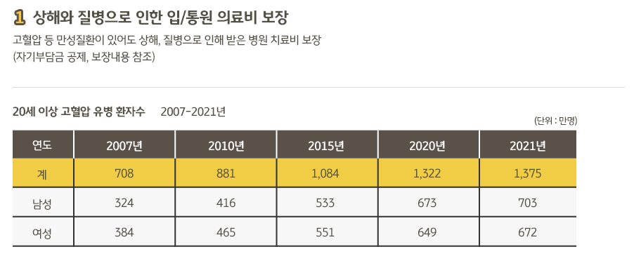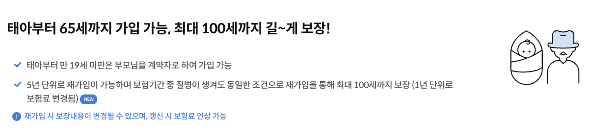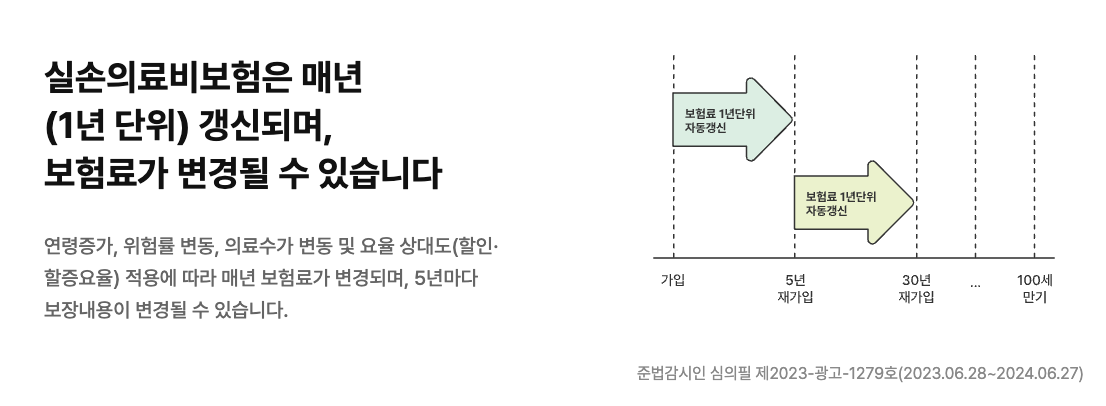 보험료는 1년 단위로 자동 갱신되며, 연령 증가 및 위험률 변경에 따라 매년 조정됩니다. 15년마다 재가입이 가능하며, 100세 만기로 설정되어 있어 장기간에 걸쳐 보장을 받을 수 있습니다.