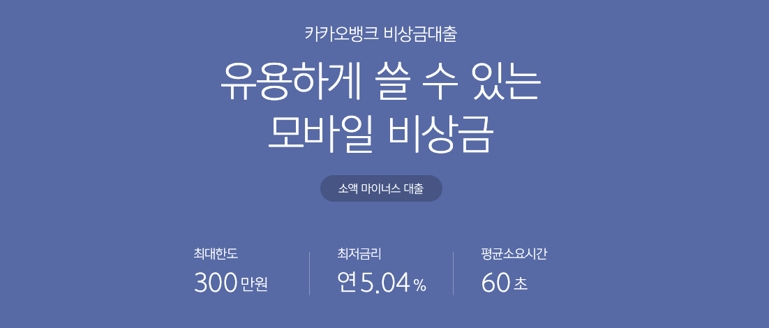 카카오뱅크의 비상금대출은 긴급한 자금이 필요할 때 빠르고 편리하게 이용할 수 있는 소액 마이너스 대출 상품입니다. 최대 300만원까지 대출이 가능하며, 최저 연 5.04%의 금리로 이용할 수 있습니다. 신청 과정은 간단하며, 평균 60초 내에 대출 가능 여부를 확인할 수 있습니다.