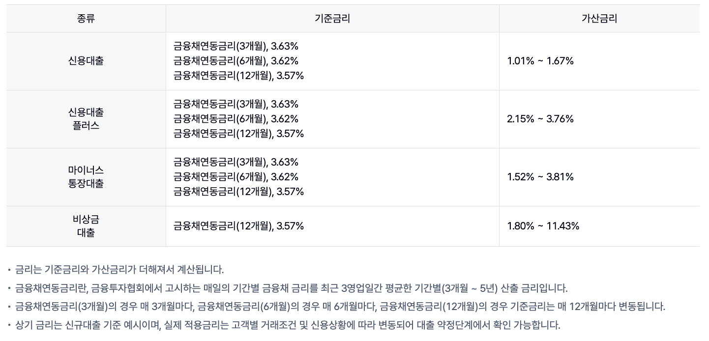 2. 대출 금리: 최저 연 3.08%부터 시작하며, 신용 점수에 따라 최고 금리도 10%대로 이용할 수 있습니다. 기준금리 변동에 따라 금리가 변경될 수 있으며, 정확한 금리는 한도 조회를 통해 확인할 수 있습니다.