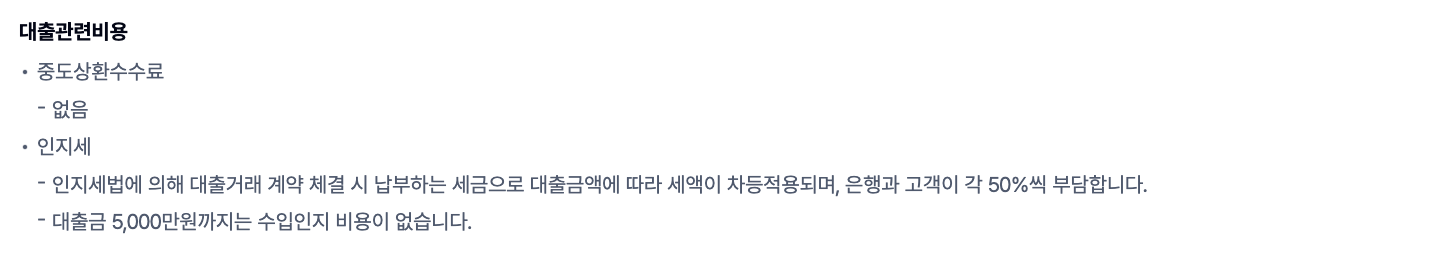 중도상환수수료가 없어 중간에 대출을 상환하더라도 추가 비용이 발생하지 않습니다. 또한, 대출 실행 시 인지세는 대출금액에 따라 세액이 차등적용되며, 은행과 고객이 각 50%씩 부담합니다. 대출금 5,000만원까지는 수입인지 비용이 없습니다.
