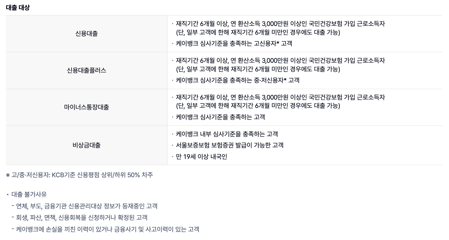 대출 대상은 재직기간 6개월 이상, 연 환산소득 3,000만원 이상인 국민건강보험 가입 근로소득자로, 일부 고객의 경우 재직기간이 6개월 미만이더라도 대출이 가능합니다. 케이뱅크의 심사기준을 충족하는 고신용자 및 중·저신용자 모두에게 대출 기회가 주어집니다.
