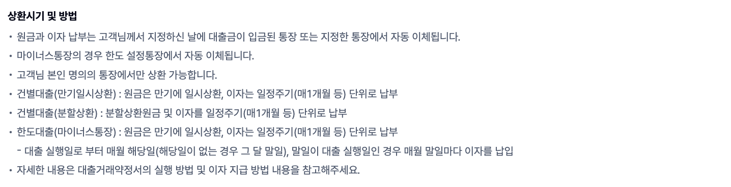 3. 대출 기간: 최대 5년까지 가능하며, 상환 방식에 따라 원리금 균등분할상환 또는 만기 일시상환을 선택할 수 있습니다. 중도상환 해약금이 없어, 원금을 중도상환할 경우 이자 부담을 줄일 수 있습니다.